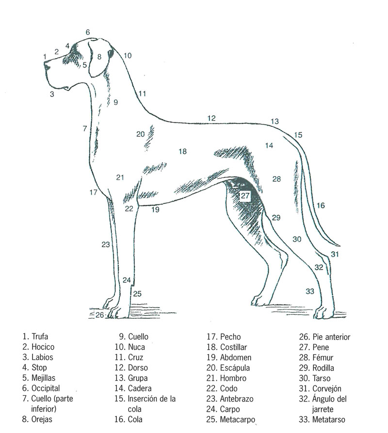 Pegada, bien pigmentada en los perros con colores sólidos. En el Dogo Alemán arlequín la distribución de la pigmentación corresponde en su mayoría con las manchas.